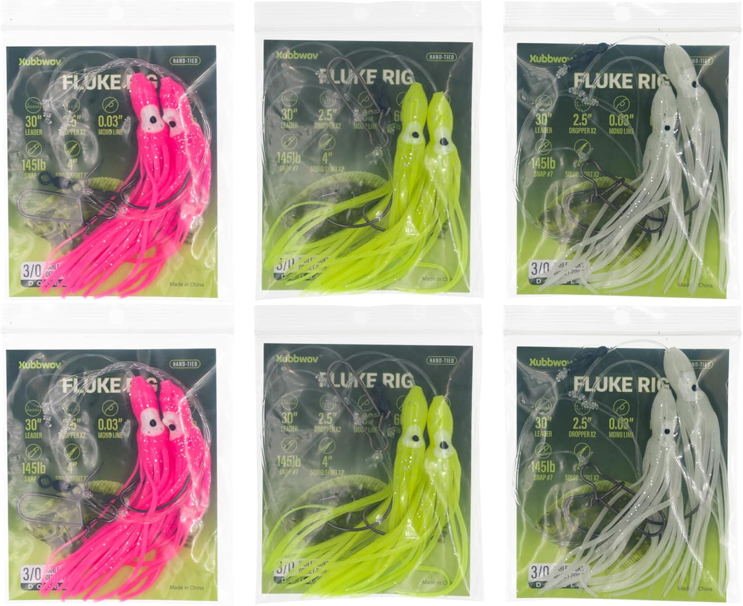 - TRIPLE ATTRACTION ASSORTMENT: Each 6-pack includes 3 high-impact colors — 2 Fluorescent Green and 2 Fluorescent Pink for high-visibility in daylight, plus 2 Glow-in-the-Dark rigs for deep water or low-light conditions. Fish any situation, any time of day.